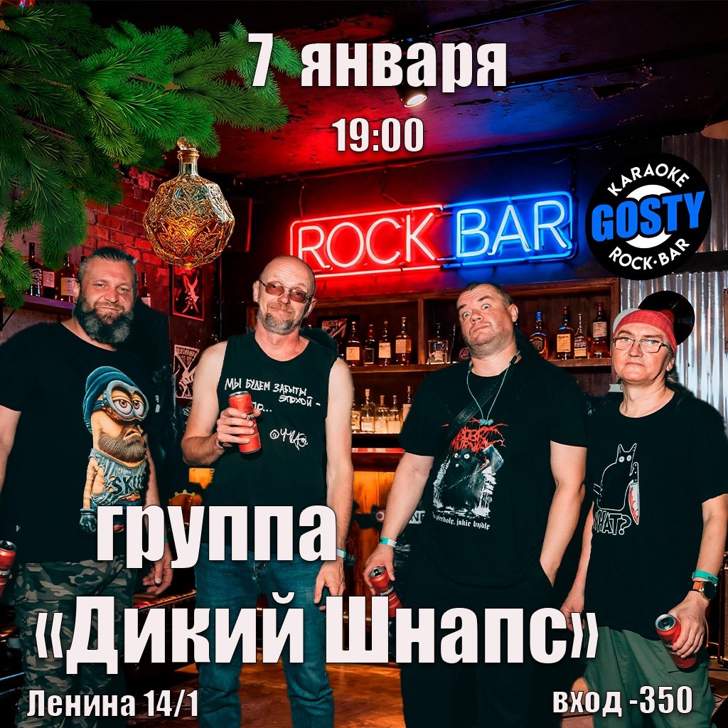 7 Января отрываемся с алкотрешхардрок группой «ДИКИЙ ШНАПС»! Оригинальный материал, искренность и неистовство стали визитной карточкой этой замечательной Омской группы! Вход впечатлительным, строго моральным и убежденным трезвенникам не рекомендуется! 21+ Сбор в 18:00, начнем примерно 19:00