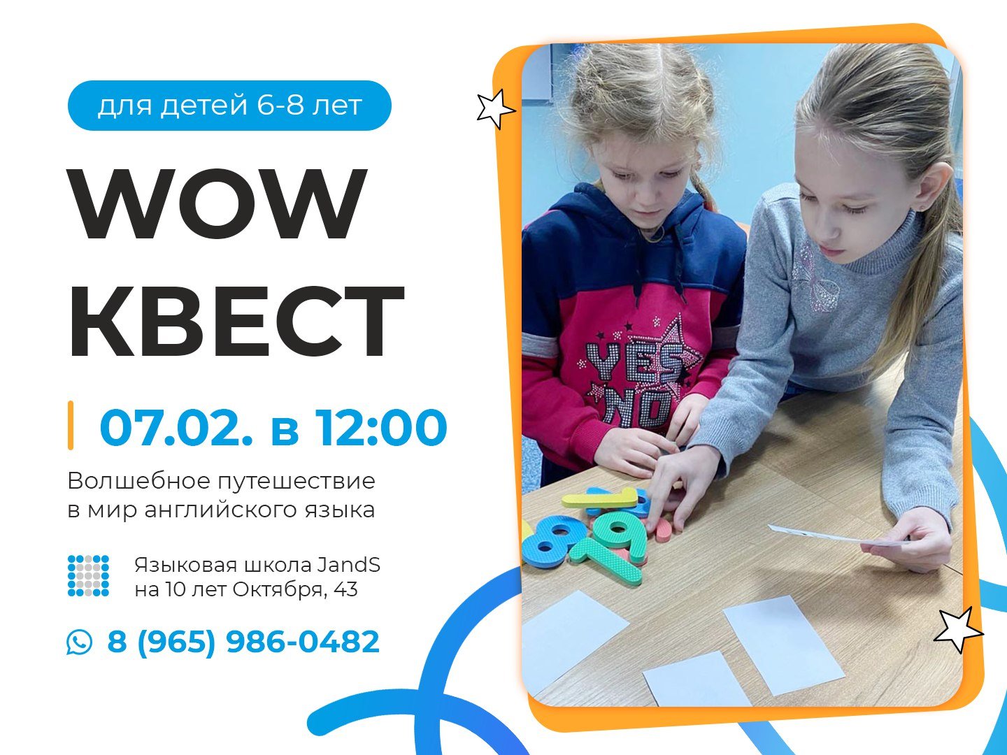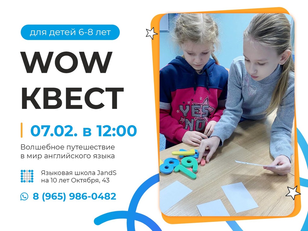 Приглашаем детей на увлекательное приключение! Мы проводим квест для детей от 6 до 8 лет, где они помогут открыть волшебный портал в мир английского языка! Когда? 07 февраля 2026 года в 12:00 Где? Языковая школа JandS, 10 лет Октября, 43 Регистрация до 05 февраля обязательна! Записывайтесь на сайте или по телефону. Не упустите шанс, пусть ваши дети станут частью этого незабываемого приключения!