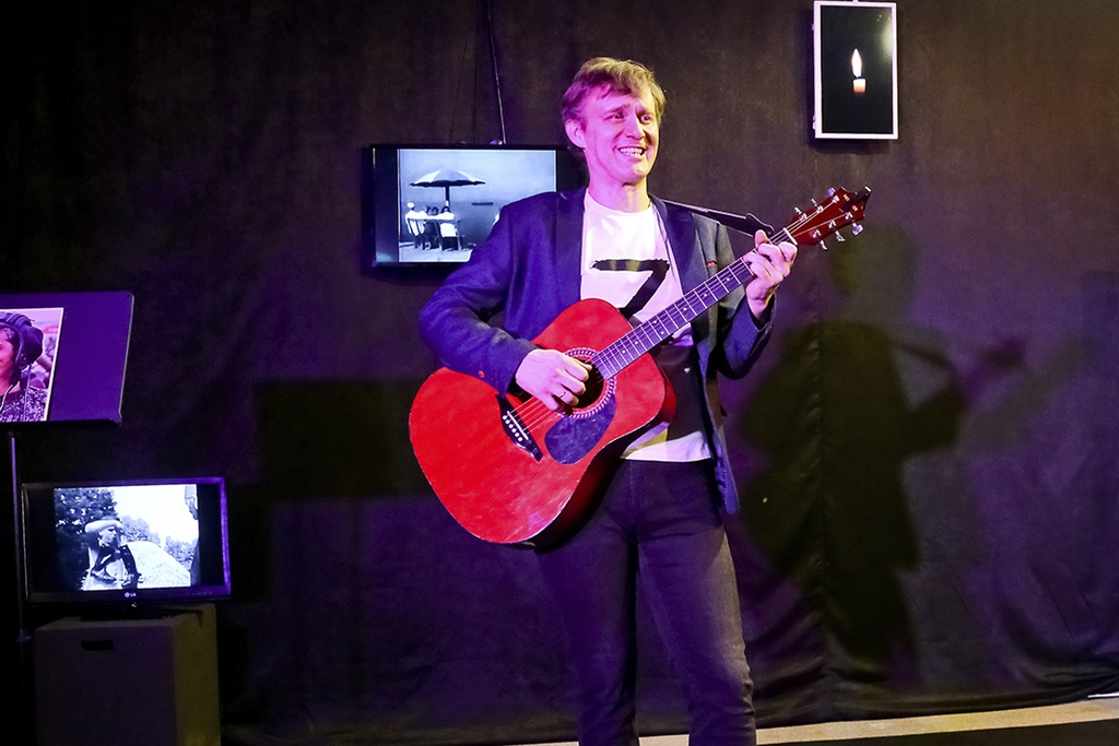 На сцене — лишь один актер. Под аккомпанемент гитары, под знакомые и знаковые песни о войне он рассказывает истории участников этих происходящих здесь и сейчас, но уже исторических событий. Спектакль очень камерный и очень личный. Его невозможно играть на большой сцене, поэтому Зеркальный зал театра стал идеальной площадкой для доверительного разговора со зрителем с глазу на глаз.
